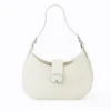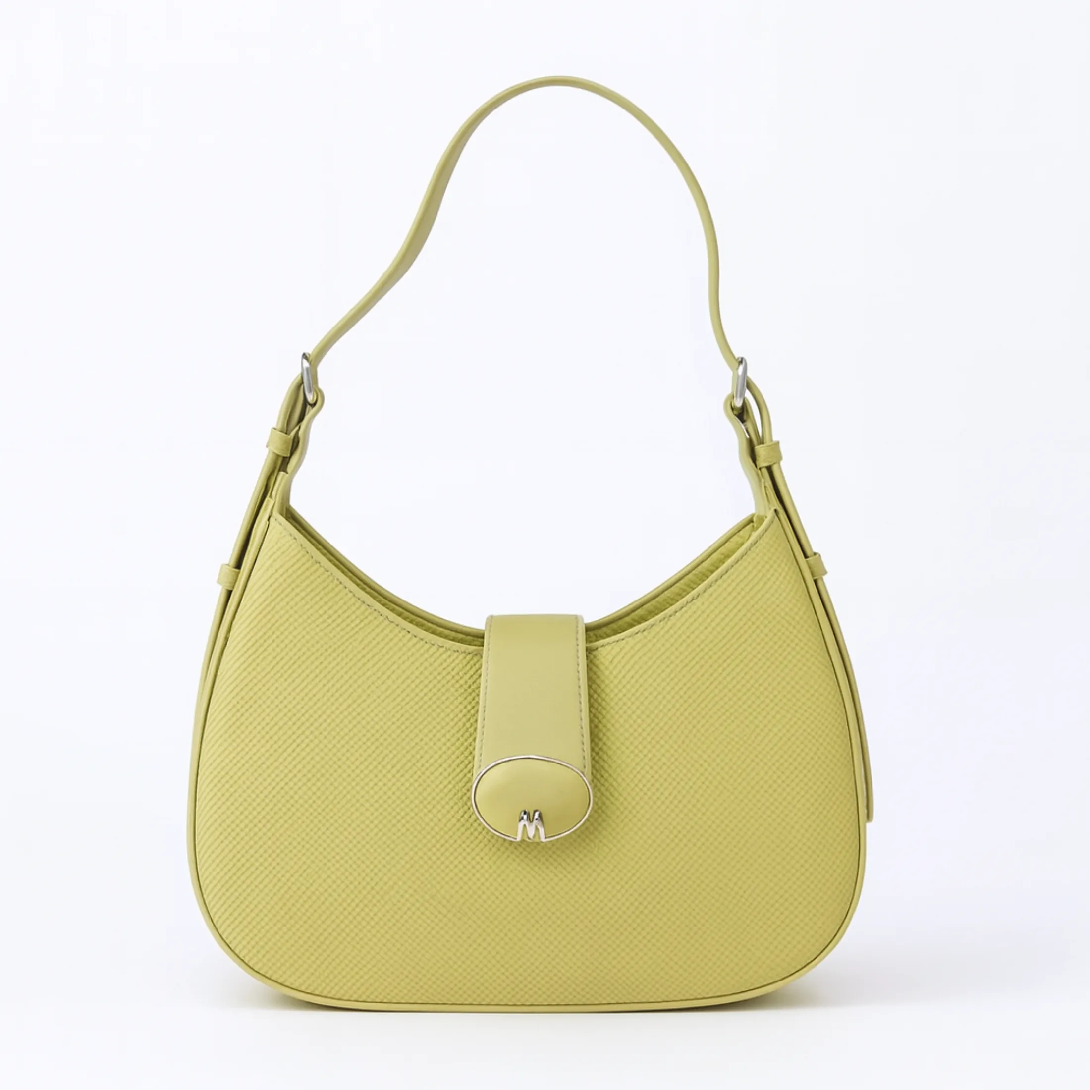 Design: A compact, crescent-shaped design with a textured exterior and a smooth Green flap closure featuring a silver-tone “M” logo.