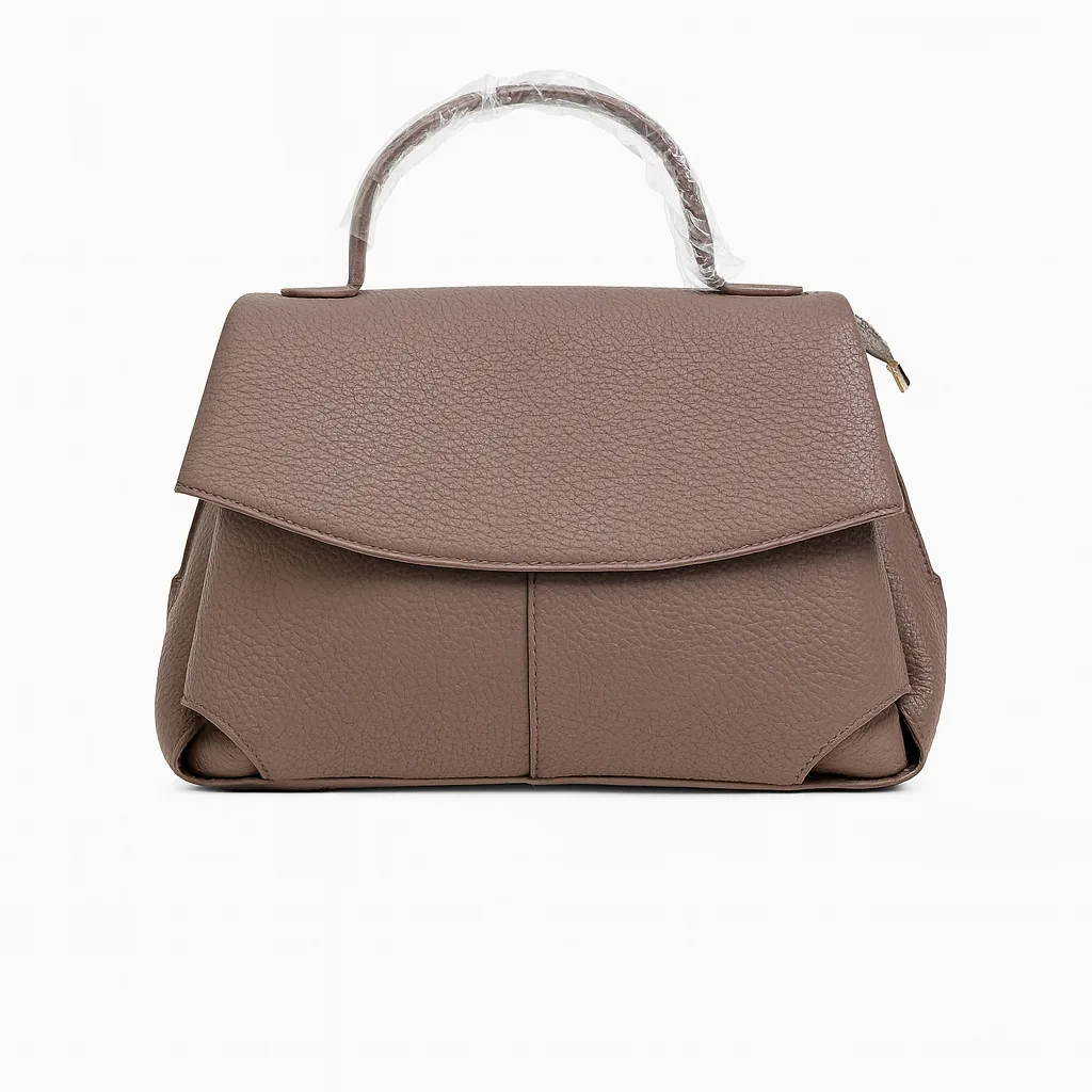 Design Elements: The unique feature of the design is the use of folded corners on the body and the flap, which creates a sculptural and modern silhouette. A smooth finish is visible beneath the main textured flap closure.